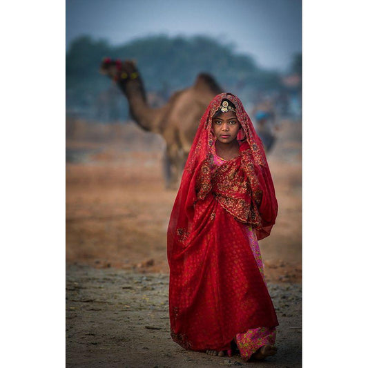 Nomad Girl In Red Dress Black Modern Wood Framed Art Print by Jabeen, Rana