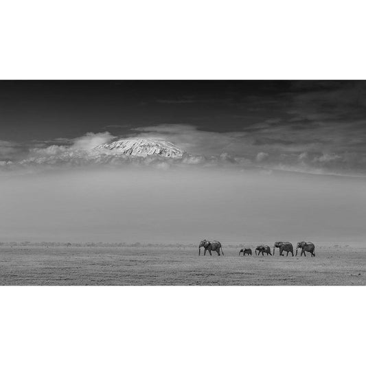 Elephant Family Under Mount Kilimanjaro Black Modern Wood Framed Art Print by Wang, Yun
