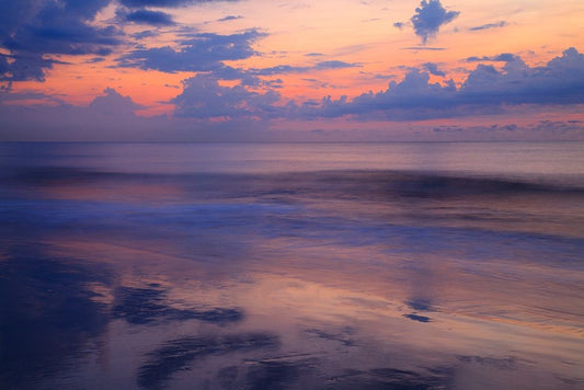 USA- Georgia- Tybee Island. Sunrise with clouds and reflections along the coast. Black Modern Wood Framed Art Print by Wells, Joanne