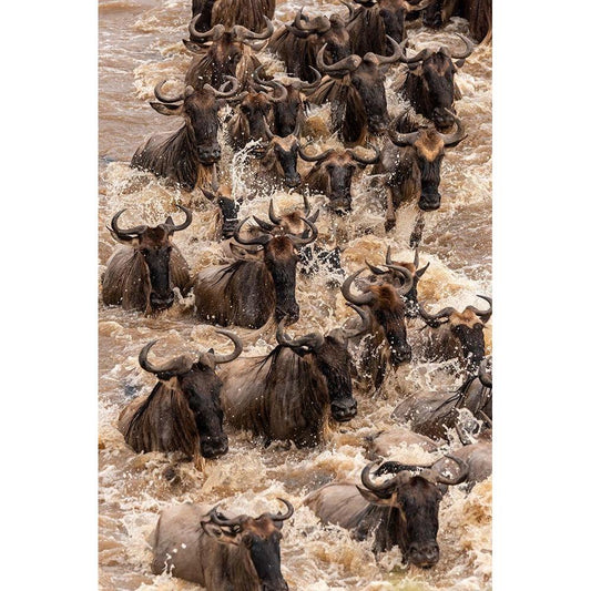 Africa-Tanzania-Serengeti National Park Wildebeests crossing Mara River Black Modern Wood Framed Art Print by Jaynes Gallery