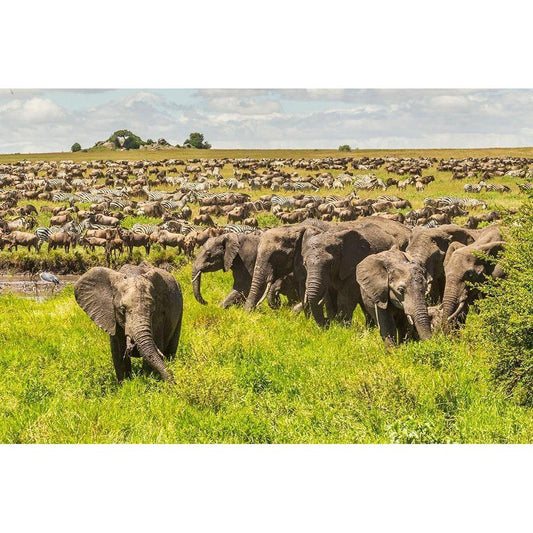 Africa-Tanzania-Serengeti National Park Migration of zebras and wildebeests with elephant herd Black Modern Wood Framed Art Print by Jaynes Gallery