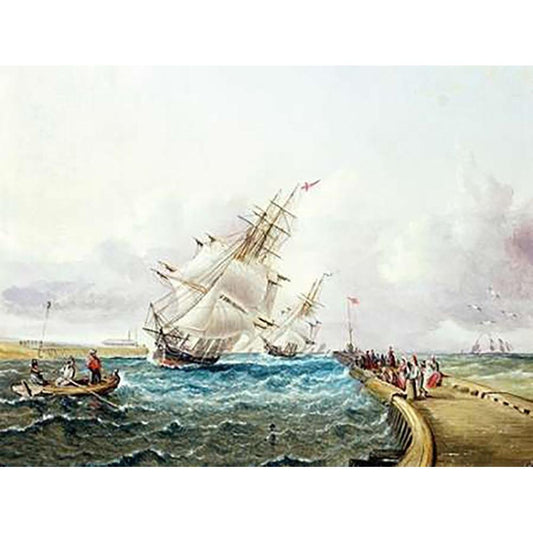 Square Rigged Ships off Jetty Black Modern Wood Framed Art Print by Buttersworth, James E.