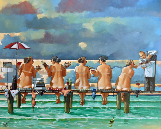 Tea Break On The Jetty Black Ornate Wood Framed Art Print with Double Matting by West, Ronald