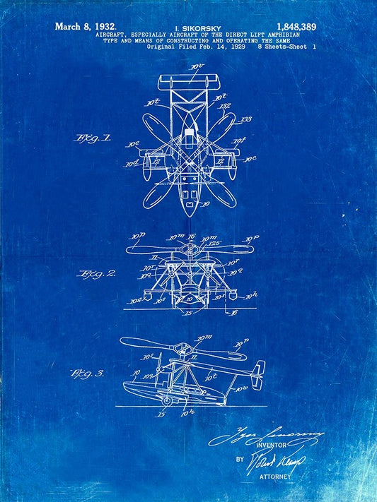 PP170- Faded Blueprint Sikorsky S-41 Amphibian Aircraft Patent Poster Black Ornate Wood Framed Art Print with Double Matting by Borders, Cole