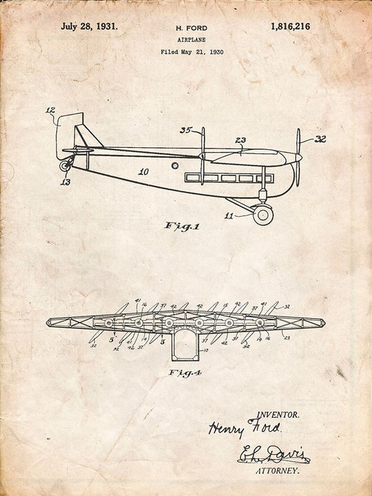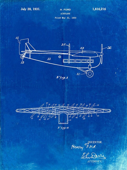 PP849-Faded Blueprint Ford Tri-Motor Airplane "The Tin Goose" Patent Poster Black Ornate Wood Framed Art Print with Double Matting by Borders, Cole