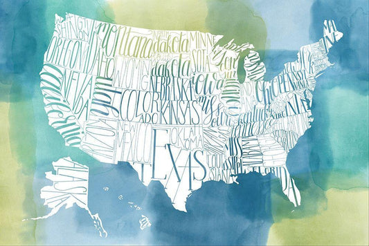 US Map on Aqua White Modern Wood Framed Art Print with Double Matting by Vision Studio