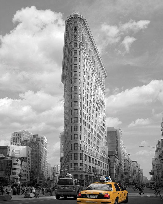 Yellow Cabs at Flatiron Building White Modern Wood Framed Art Print with Double Matting by Maloratsky, Igor