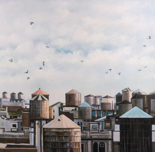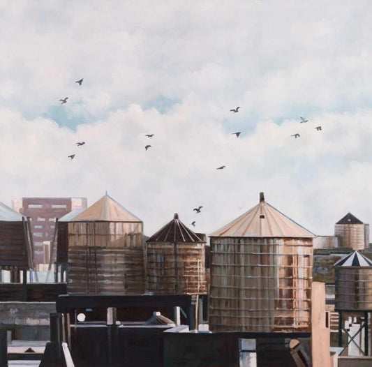 Water Towers with Birds White Modern Wood Framed Art Print with Double Matting by Atelier B Art Studio