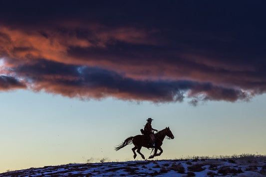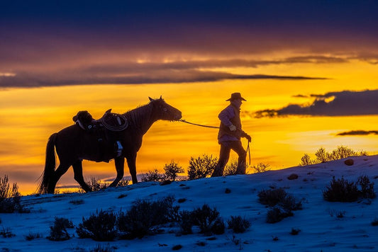 USA- Wyoming. Hideout Horse Ranch- wrangler and horse at sunset. White Modern Wood Framed Art Print with Double Matting by Looney, Hollice