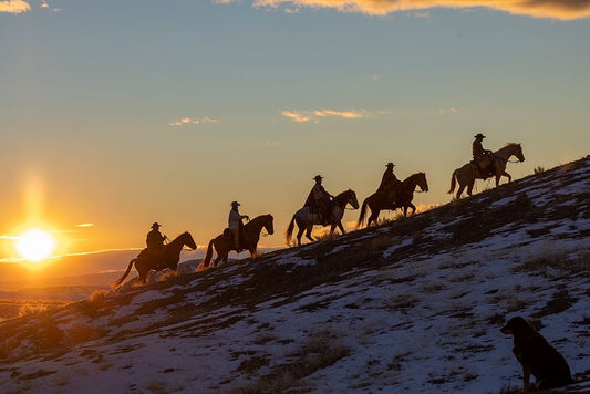 USA- Wyoming. Hideout Horse Ranch- wranglers on horseback in snow at sunset. White Modern Wood Framed Art Print with Double Matting by Looney, Hollice
