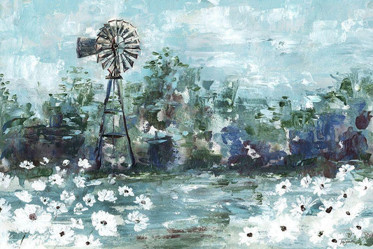 Windmill and Daisies Landscape White Modern Wood Framed Art Print with Double Matting by Tre Sorelle Studios