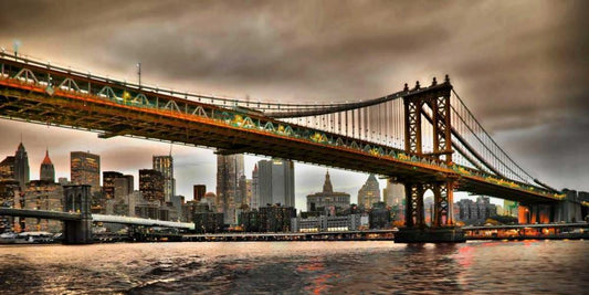 Manhattan Bridge and New York City Skyline, NYC White Modern Wood Framed Art Print with Double Matting by Ratsenskiy, Vadim
