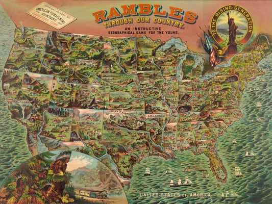 Game board with map of America, 1890 White Modern Wood Framed Art Print with Double Matting by Anonymous