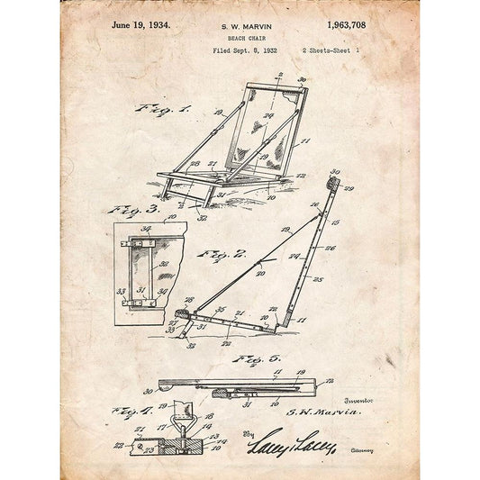 PP696-Faded Blueprint 1930s Beach Chair Wall Art Poster Gold Ornate Wood Framed Art Print with Double Matting by Borders, Cole