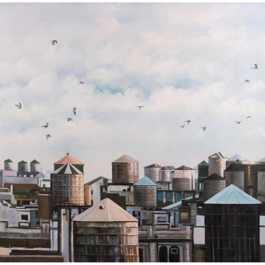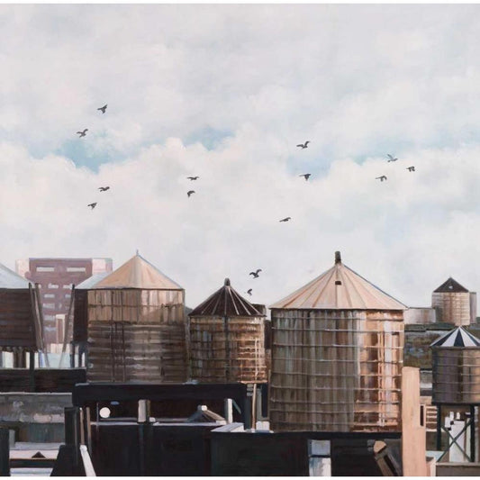 Water Towers with Birds Black Modern Wood Framed Art Print by Atelier B Art Studio