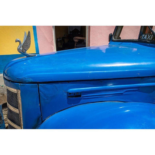 Detail of classic blue American car with chrome swan hood ornament in Trinidad-Cuba Black Modern Wood Framed Art Print by Miglavs, Janis