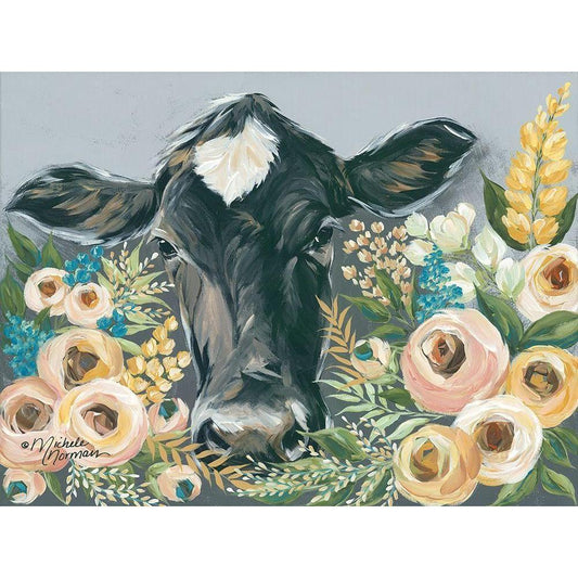 Cow in the Flower Garden Black Modern Wood Framed Art Print by Norman, Michele