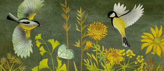 Gold Foil Birds II with Hand Color White Modern Wood Framed Art Print with Double Matting by Nozeman