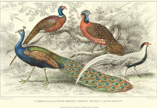 Peacock and Pheasants White Modern Wood Framed Art Print with Double Matting by Stewart, J.