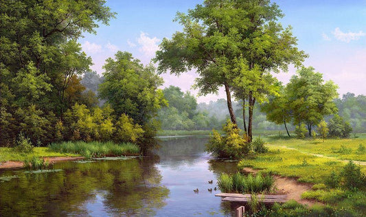 Landscape with ducks White Modern Wood Framed Art Print with Double Matting by Babichev, Vyacheslav