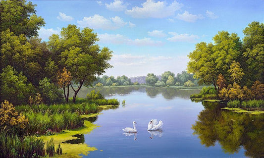 Landscape with swans White Modern Wood Framed Art Print with Double Matting by Babichev, Vyacheslav