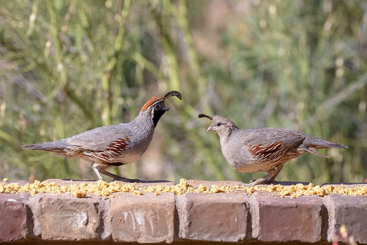 USA-Arizona-Buckeye-Pair of Gambels quail feeding on brick wall White Modern Wood Framed Art Print with Double Matting by Jaynes Gallery