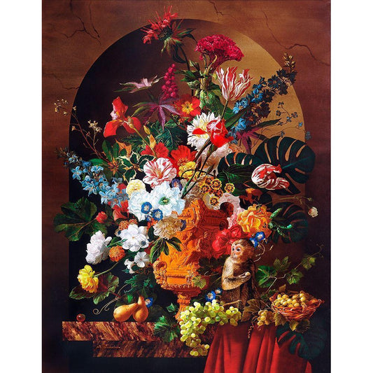 Still life with a monkey, flowers and fruits Black Modern Wood Framed Art Print with Double Matting by Golovin, Konstantin