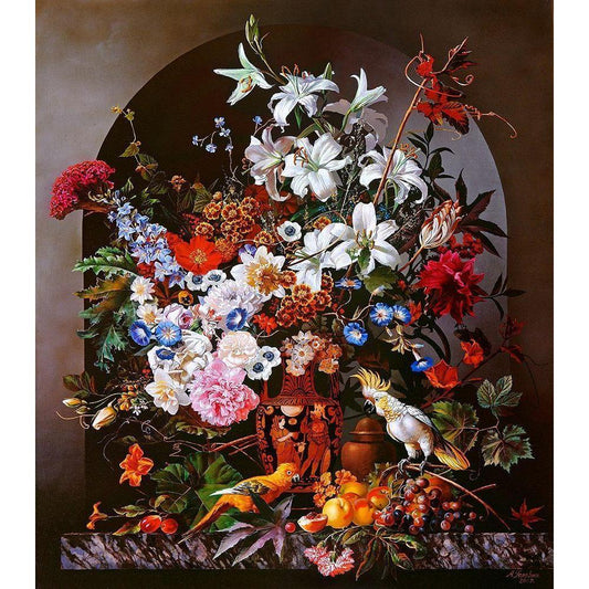 Still-life with a parrot Black Modern Wood Framed Art Print with Double Matting by Golovin, Konstantin