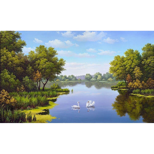 Landscape with swans Black Modern Wood Framed Art Print with Double Matting by Babichev, Vyacheslav