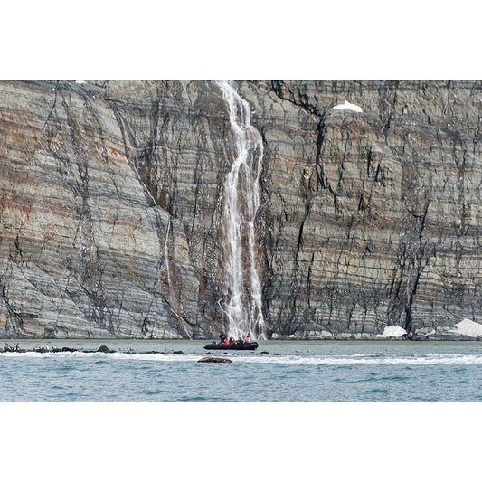 Zodiac approaching waterfall and king penguins on the beach-Gold Harbour-South Georgia-Antarctica Black Modern Wood Framed Art Print with Double Matting by Su, Keren