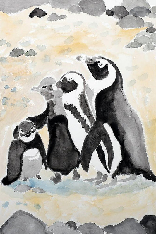 African Penguin Family White Modern Wood Framed Art Print with Double Matting by Derr, Wynn