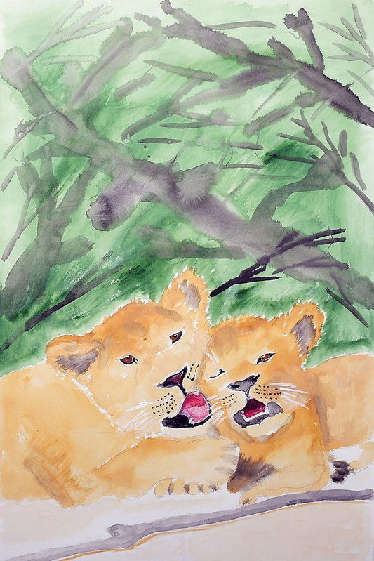 Lion Cubs White Modern Wood Framed Art Print with Double Matting by Derr, Wynn