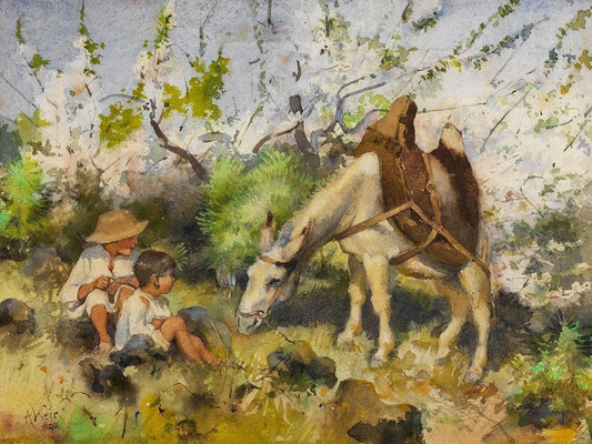 Summer landscape with children and donkey White Modern Wood Framed Art Print with Double Matting by Weir, J Alden
