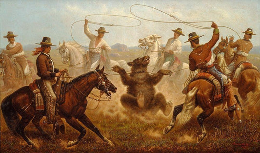 Cowboys Roping a Bear White Modern Wood Framed Art Print with Double Matting by Walker, James