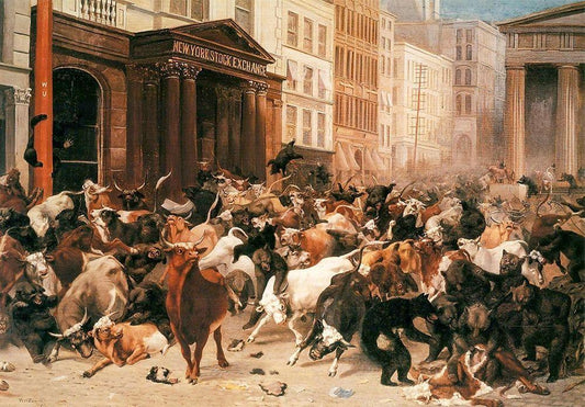 Bulls and Bears in the Market White Modern Wood Framed Art Print with Double Matting by Beard, William Holbrook