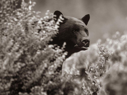 Black bear in underbrush Sepia White Modern Wood Framed Art Print with Double Matting by Fitzharris, Tim