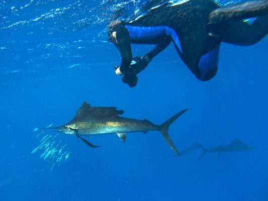 Sailfish-diver and sardines-Isla Mujeres-Mexico White Modern Wood Framed Art Print with Double Matting by Fitzharris, Tim