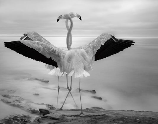 Flamingos Duet White Modern Wood Framed Art Print with Double Matting by Wisniowska, Krystina