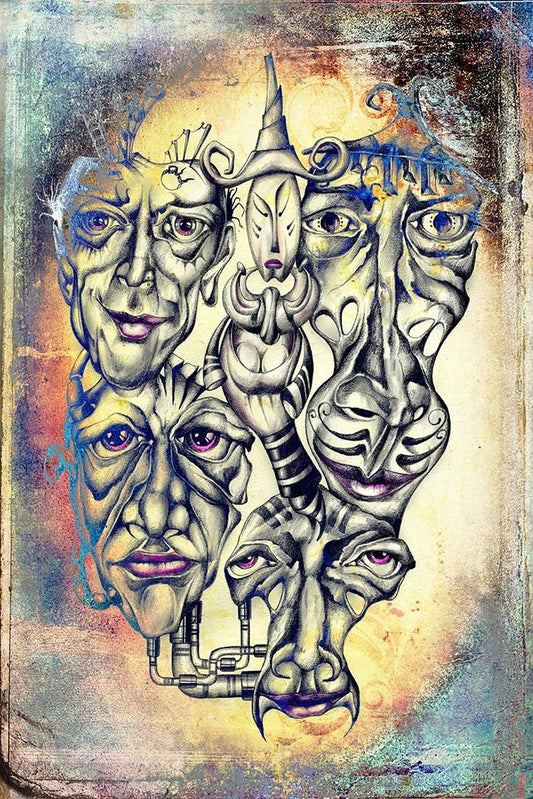 Shaman and faces of souls White Modern Wood Framed Art Print with Double Matting by Kulik, Rafal