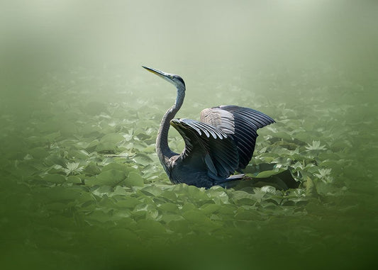 blue heron in a green dream White Modern Wood Framed Art Print with Double Matting by Chen, Jennifer