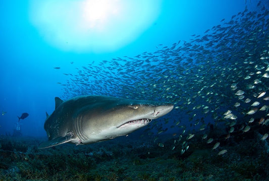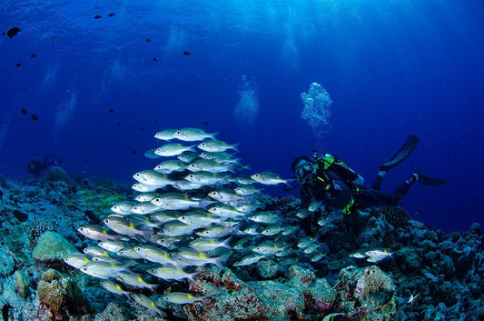 Fish And DIVers White Modern Wood Framed Art Print with Double Matting by Y Lin, Ryan