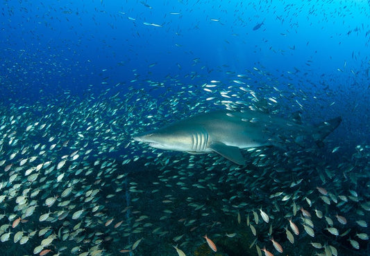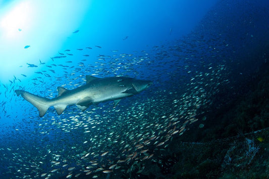 Sand Tiger Shark And Fish White Modern Wood Framed Art Print with Double Matting by Y Lin, Ryan
