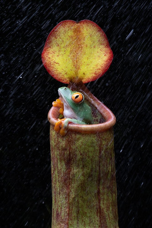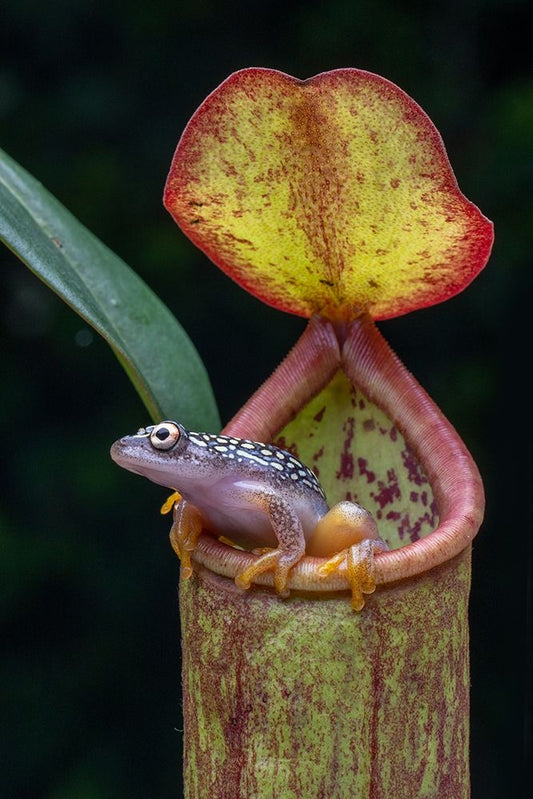 The Frog And Nepenthes White Modern Wood Framed Art Print with Double Matting by Setiadi, Ajar