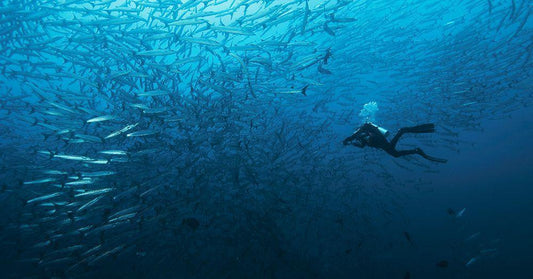 In A Fishschool Of Barracudas. White Modern Wood Framed Art Print with Double Matting by Yevtushyk, Dmitriy