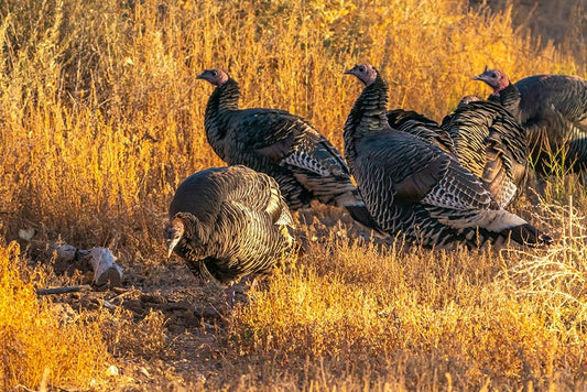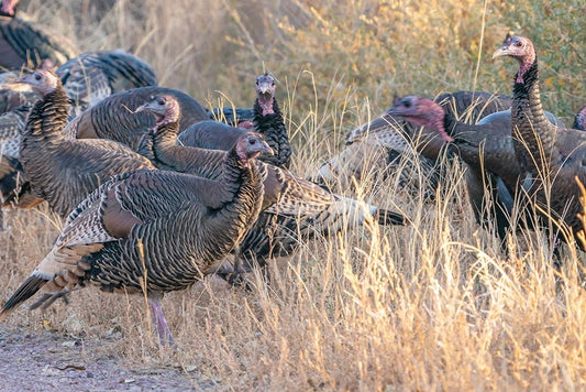 USA- New Mexico- Bosque Del Apache National Wildlife Refuge. Close-up of female wild turkeys. White Modern Wood Framed Art Print with Double Matting by Jaynes Gallery