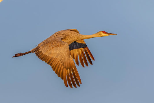 Sandhill crane flying at sunrise Bosque del Apache National Wildlife Refuge-New Mexico White Modern Wood Framed Art Print with Double Matting by Jones, Adam
