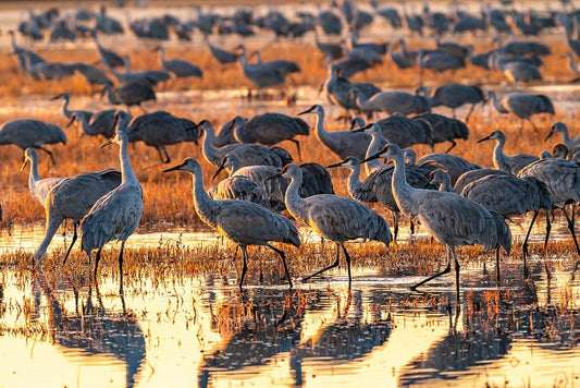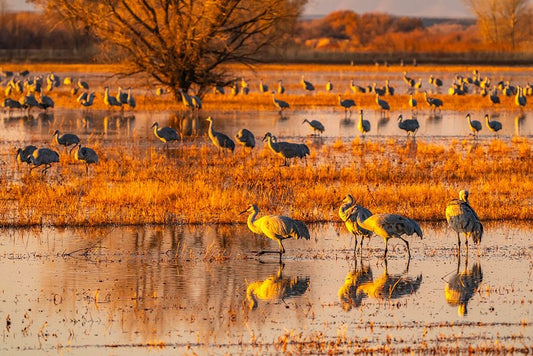 USA-New Mexico-Bosque Del Apache National Wildlife Refuge-Sandhill cranes in water at sunrise White Modern Wood Framed Art Print with Double Matting by Jaynes Gallery