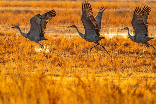 USA-New Mexico-Bosque Del Apache National Wildlife Refuge-Sandhill cranes taking flight at sunrise White Modern Wood Framed Art Print with Double Matting by Jaynes Gallery