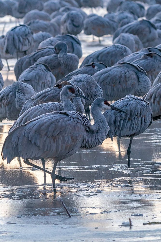USA-New Mexico-Bernardo Wildlife Management Area-Sandhill cranes in icy water on foggy sunrise White Modern Wood Framed Art Print with Double Matting by Jaynes Gallery