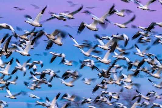 USA-New Mexico-Bernardo Wildlife Management Area-Blur of snow geese in flight at sunset White Modern Wood Framed Art Print with Double Matting by Jaynes Gallery